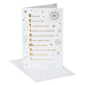 Show moreCelebrate the remarkable journey of retirement with this exquisite card from American Greetings. Designed with elegance and a touch of whimsy, it features a heartwarming front message that encourages relaxation and the exploration of new adventures, making it a delightful way to express your wishes. The card captures the essence of what retirement should embody: a time to play, dream, and entertain wild ideas. The inside complements this theme perfectly with a thoughtful message congratulating the recipient on their decades of hard work and achievements. Printed on luxurious textured white paper stock, the card incorporates stunning gold foiled lettering and a charming starburst motif, ensuring that your sentiments shine bright.