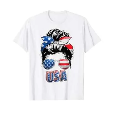 American Mom Life Messy Bun Women 4th of July Girl USA Flag T-Shirt