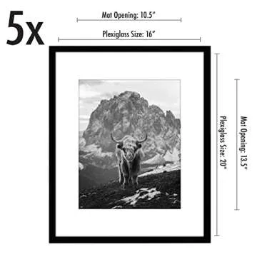 One of the standout features is the ease of installation - the frames can be hung vertically or horizontally, giving you the flexibility to style your wall however you choose. Each frame fits a 16x20 photo perfectly, but with the included mat, you can also display an 11x14 piece, allowing for even more versatility in your decor. The mat area measures 10.5x13.5 inches, providing a stunning border to your imagery.