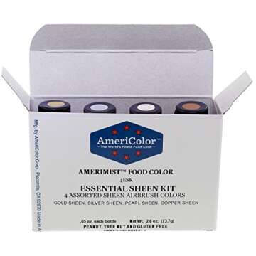 Show moreUnleash Your Creativity with the ultimate kit for decorators and bakers alike! This exceptional kit includes four magnificent airbrush sheen colors: Gold Sheen, Silver Sheen, Pearl Sheen, and Copper Sheen, each in a convenient .65oz squeeze bottle. Designed by AmeriColor, a trusted name in food coloring, these colors are crafted to meet and exceed all your decorating needs.