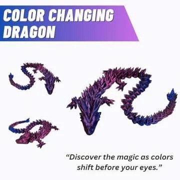 Show more Unveil the magic of imagination with the **Amerimaker 20" Articulated Dragon**, a mesmerizing fusion of creativity and craftsmanship. This stunning color-changing 3D printed dragon is designed to be more than just a toy; it invites you to engage in fantastical tales and daring adventures. With flexible joints that allow for an impressive range of poses, this dragon isn't just a figure - it transforms into whatever your mind concocts, be it a fearsome guardian or a whimsical companion. The rich blue and red hues dance vividly with each change, making it a captivating focal point in any collection.