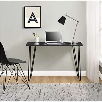 The Owen Retro Desk is a beautifully designed piece of furniture that combines style and functionality, perfect for smaller living spaces. Crafted from high-quality laminated particleboard and supported by durable metal hairpin legs, the desk showcases a stunning Black Oak Finish that seamlessly matches the sleek black legs, giving it an industrial vibe that fits right into modern interiors.