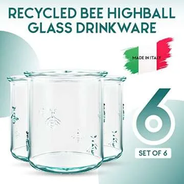 Show more Discover the charm and elegance of the Amici Home Regina DOF Glass, a stunning set of six drinking glasses that perfectly embodies a blend of sustainability and style. Crafted from recycled green glass, each glass offers a delightful visual appeal while contributing to eco-friendly living. The enchanting embossed bee design elegantly wraps around the glasses, infusing nature's beauty into your everyday drinking experience. Measuring a convenient 3.25 inches in diameter and 3.75 inches in height, with a generous capacity of 12 ounces, these versatile glasses are perfect for serving everything from refreshing water to invigorating juices and even cocktails for your guests.