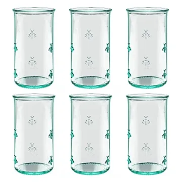 Amici Home Regina Hiball Glass | 18 Oz | Set of 6 Italian Made, Recycled Green Glass with Embossed Bee Design