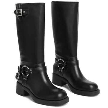 Show moreIntroducing the AMINUGAL Black Knee High Boots for Women, where style meets comfort in a stunning design perfect for any wardrobe. These versatile pull-on boots are crafted with a chic buckle detail and a robust zipper design, allowing for effortless wear while providing an edgy charm to your outfits. The chunky block heel gives a flattering rise that complements any ensemble, making them an essential addition whether you’re headed to a country music festival or a casual outing. With their robust rubber sole, these boots offer stability and traction, ensuring you feel confident on any terrain.