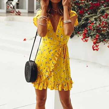 Amlaiworld Women Wrap Dress V Neck Dress Summer Beach Dress Sexy Bandage Evening Party Casual Short Mini Dress Yellow