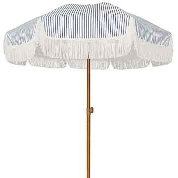 AMMSUN 7ft Patio Umbrella with Fringe Outdoor Tassel Umbrella UPF50+ Premium Steel Pole and Ribs Push Button Tilt, Navy Blue Stripes