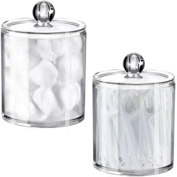Show more Introducing the perfect solution for all your organization needs - our charming 2-pack clear Q-tip holder dispenser set! This delightful apothecary jar collection, crafted from thick, clear, food-grade plastic, lands a perfect balance of durability and aesthetics. Designed with practicality in mind, these jars come in two sizes (12oz & 15oz), ideal for neat storage in narrow spaces such as your bathroom, kitchen, vanity, or office. Imagine having all your small essentials like Q-tips, cotton balls, and floss picks displayed elegantly in these stylish containers.