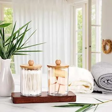 Amolliar Qtip Dispenser Apothecary Jars with Bamboo Lids - 12 oz Clear Plastic Vanity Makeup Organizer Storage Canister - Bathroom Accessories for Q-Tips, Cotton Swab, Cotton Ball, Floss (2)