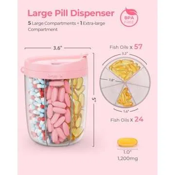 AMOOS Large Pill Dispenser with 6 Compartments, Anti-Mix Pill Bottle Organizer with Wide Opening & Easy Retrieval, Vitamin Organizer for Travel, BPA-Free Pill Box with a Strap and 20 Sticky Labels