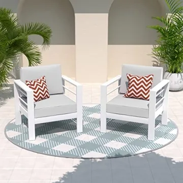 Show moreIntroducing the **Amopatio Oversized Aluminum Patio Armchair**, a perfect blend of style and comfort designed for your outdoor retreat. This elegantly crafted seating solution not only enhances your patio aesthetics but also ensures durability and longevity, thanks to its high-quality aluminum construction. The set includes two armchairs, each featuring 5-inch thick cushions that provide plush comfort, making them ideal for lounging with friends or family on a sunny day. The sophisticated white and light grey color palette offers a modern touch, seamlessly integrating with various outdoor themes. Each chair is accompanied by waterproof sofa covers to protect them from the elements, allowing you to enjoy outdoor living without worry.
