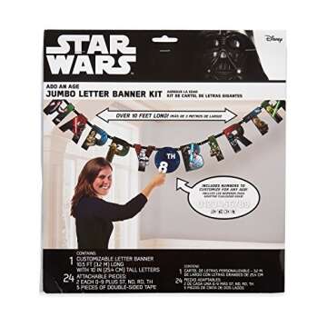 Celebrate your little Jedi's special day with the Amscan Star Wars Party Supplies Add-an-Age Birthday Party Banner, a stunning addition to your Star Wars themed birthday celebrations! This banner stretches over 10 feet, showcasing vibrant graphics featuring iconic characters like Luke Skywalker, Yoda, Darth Vader, and Chewbacca, ensuring that your party decor is truly out of this galaxy. The customizable...