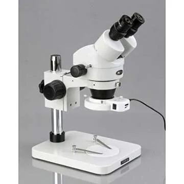 Show moreStep into the world of precision and clarity with the AmScope SM-1BSX-64S Professional Binocular Stereo Zoom Microscope. Designed for both the dedicated professional and the enthusiastic hobbyist, this remarkable microscope carries an array of features that elevate your observation experience. With its robust pillar stand, this microscope ensures a long working distance — an essential aspect for handling larger items like circuit boards or dental appliances. Benefit from the 10x super-widefield eyepieces that allow for comfortable viewing while minimizing eye and neck strain, thanks to the fixed 45-degree inclination that is further complemented by an adjustable interpupillary distance. Collaboration is made simple with the 360-degree rotation capability, ensuring you can easily share your findings with colleagues or friends without the hassle of moving the entire unit.