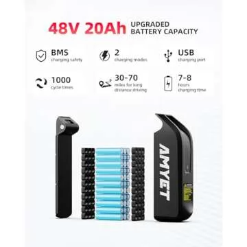 Show more Introducing the AMYET V9-G60 Peak 1500W Ebike, a revolutionary electric bike that enhances your riding experience with its powerful features. At the heart of this bike lies a 1000W brushless motor, boasting a peak output of 1500W, providing you with the thrilling ability to conquer speeds up to 32MPH. Feel the rush of freedom as you tackle any terrain, from urban streets to rugged mountain paths, all while enjoying the significant range of 30-70 miles on a single charge thanks to the 48V 20AH removable battery. This eco-friendly choice not only reduces your carbon footprint but also cuts down on gas and maintenance costs, enabling you to ride with both style and conscience.