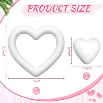 Show more Transform your crafting experience with this delightful set of Heart Foam Wreaths and Balls, perfect for expressing love and creativity! This package includes 8 exquisite white heart foam wreaths measuring about 18.5 cm (7.28 inches) and 8 adorable heart-shaped foam balls measuring about 8.5 cm (3.35 inches), totaling 16 pieces to fulfill all your decorative dreams.