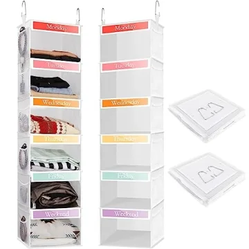 Show more Introducing the Amylove 2 Pack 6 Weekly Shelf Hanging Closet Organizer! Transform your child's closet into an organized haven with this innovative solution designed specifically for busy families. Each organizer features a unique side pocket design that includes 6 spacious pockets on each side, perfect for storing everything from socks and hats to T-shirts and kid's clothes. This clever layout not only keeps items well-organized but also maximizes your closet space, making it a must-have for parents looking to simplify daily routines.