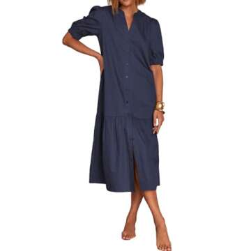 AmySister Women's Casual Short Sleeve Drop Waist Midi Dress with Pockets L Navy