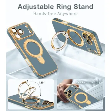 Show more Introducing the Amzfield Magnetic for iPhone 17 Pro Case, the epitome of style and functionality. This beautifully crafted case in a stunning Grey Blue is designed exclusively for the iPhone 17 Pro, marrying a chic aesthetic with advanced protective features. Its standout feature is the integrated magnetic ring holder paired with an adjustable kickstand, offering seamless compatibility with MagSafe accessories. Effortlessly switch between viewing angles from 0° to 120° with our innovative smooth non-inductive bearing technology. Experience the perfect blend of elegance and protection as this case guards your device while enhancing its natural beauty.