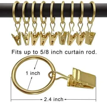 Show more Introducing a stunning Set of 44 Curtain Rings with Clips that will transform your home decor while providing exceptional functionality! Crafted from premium metal with a beautiful polished finish, these curtain rings not only look exquisite but also offer unparalleled durability. With an interior diameter of 1 inch, they fit curtain rods with a diameter of 6/8 inch or smaller, ensuring a perfect fit for your home. Whether you're looking to hang delicate sheer curtains or heavier drapery, these rings can handle it all!