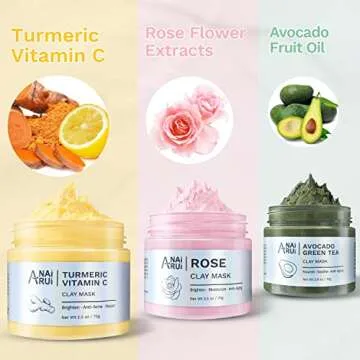 Show more Discover the ultimate skincare experience with the ANAIRUI SPA Facial Mask set, a trio of exquisite clay masks designed to rejuvenate your skin. This exceptional trio includes Turmeric Vitamin C Clay Mask, Rose Pink Clay Mask, and Avocado Green Tea Mud Mask. Each mask has been meticulously crafted using natural and clean ingredients to suit all skin types, making it the perfect gift for anyone passionate about their skincare routine.