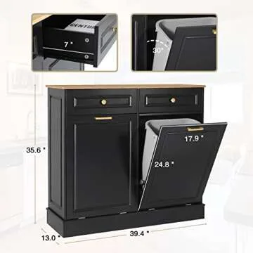Show moreTransform your kitchen with the Anbuy Dual Tilt Out Cabinet, a beautifully crafted piece designed to revolutionize how you handle waste and recycling. Measuring an impressive 35.6”H x 39.4”L x 13”W, this cabinet accommodates up to a 10-gallon trash can, ensuring you have the space you need while keeping your space tidy. The bamboo top surface not only provides extra counter space for meal prep or decoration, but it also effortlessly complements a variety of kitchen aesthetics while cleaning easily and withstanding a remarkable 66lbs.