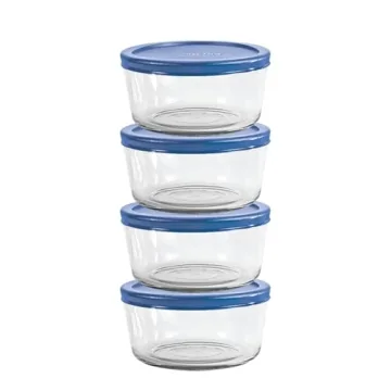 Show more Introducing the Anchor Hocking Glass Storage Set, a perfect blend of functionality and elegance for your kitchen! This remarkable set includes (4) 2-cup round food storage containers and (4) vibrant blueberry SnugFit lids. Made from durable glass, these containers are designed to be all-recyclable, ensuring you contribute to a cleaner environment while enjoying your meals. Unlike plastic or metal alternatives, glass won’t stain or retain odors, providing you with a fresher food storage experience each time.