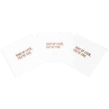 Show more Introducing the **Andaz Press White with Foil "Shut Up Liver, You're Fine" Cocktail Napkins** – the perfect blend of elegance and humor for any festive occasion! This bulk pack of 100 cocktail napkins is designed not just for functionality but also to infuse fun into your celebrations. Crafted from durable 3-ply paper, these napkins are soft to the touch yet sturdy enough to tackle those lively parties. With their charming rose gold foil imprint, they'll not only serve your guests well but also add a dash of style to your bar setup, whether it’s a home gathering or a grand event.