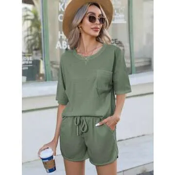 Andeip Women's Pajama Set Waffle Knit Lounge Set Short Sleeve Top and Shorts 2 Piece Loungewear Outfits Olive Green L