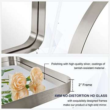 Show more Discover the perfect blend of style and functionality with our exceptional arched bathroom mirror, crafted meticulously for those who appreciate quality. Weighing 23.81lbs, this mirror is designed to withstand the test of time with its premium materials, superior to lesser quality mirrors. The brushed nickel frame not only adds a touch of elegance but also ensures durability against humidity, making it ideal for any bathroom setting. Each mirror encompasses a no-distortion HD floating glass, providing a clear reflection that enhances your decor.