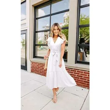 Show moreStep into a world of elegance and charm with the Angashion Women’s Dresses Short Sleeve Wrap V Neck Ruffle Floral Printed Midi Dress with Belt. This exquisite piece is designed for the modern woman who appreciates both comfort and style. Featuring a captivating floral print and breathable fabric, the dress encapsulates a gentle, feminine vibe while remaining flattering for various body types. The unique wrap V-neck showcases your neckline gracefully, while the ruffle short sleeves add a playful touch to the overall design. Whether you're attending a wedding, a casual date, or spending a lovely day at the beach, this midi dress is the perfect addition to your wardrobe. The removable belt allows you to adjust your look effortlessly, creating a defined waistline or a more relaxed fit as desired. What's more, the lightweight, flowy structure ensures comfort throughout the day, making it your go-to dress for any occasion.
