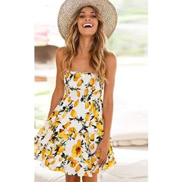 Angashion Women's Floral Strapless Pleated Flowy Skater Mini Tube Dress Lemon