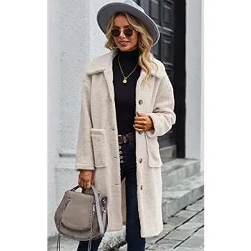 Show more Transform your seasonal wardrobe with the Angashion Women's Fuzzy Fleece Lapel Open Front Long Cardigan Coat. Designed for the modern woman, this versatile jacket is a delightful fusion of style and comfort. Crafted from a luxurious blend of 65% cotton and 35% polyester, the material wraps you in warmth and coziness, making it the perfect choice for chilly days. With its casual, long sleeves and knee-length silhouette, this coat embodies effortless chic, allowing you to dress it up for work or keep it casual for weekend outings. The faux fur texture and lapel design add a fashionable touch, ensuring you look as great as you feel. Available in a dreamy light beige color, this coat is a must-have for your fall and winter outfits, providing the perfect layering option over your favorite tops and sweaters.