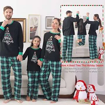 Show more Embrace the spirit of the season with our unique family holiday pajamas set, designed to bring warmth and joy to your festive celebrations. These adorable pajamas feature a delightful holiday-inspired design, complete with cute letter prints, long sleeves, and a comfortable round neck top paired with classic plaid long pants. The elastic waistband ensures easy wearing, making these two-piece loungewear sets perfect for all family members. Each night of Christmas will become a special cherished moment as your family dons matching styles, creating Instagram-worthy memories.