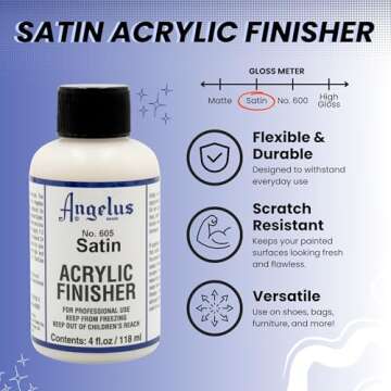 Show moreThe Angelus 605 Satin Finisher is a **premium-grade acrylic finisher** designed for artists, DIY enthusiasts, and sneakerheads alike. Hailing from the trusted **Angelus Brand**, this versatile product is specifically formulated to provide exceptional protection for your painted surfaces, ensuring that your creative projects stand the test of time. With its unique **water-resistant** properties, this 4 oz. bottle serves as a reliable shield against scratches, scrapes, and fading, making it an essential addition to your crafting toolkit.