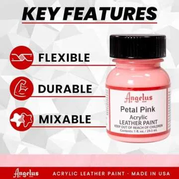 Show moreTransform your leather items into vibrant works of art with **Angelus Acrylic Leather Paint** in **Petal Pink**. This premium, water-based paint is designed specifically for leather surfaces, making it perfect for restoring, customizing, or completely revamping your favorite boots, jackets, athletic shoes, purses, and more. With a swift-drying formula, this 1-ounce bottle provides exceptional coverage and a rich, durable color that will enhance the beauty of any leather project. Plus, its non-toxic composition ensures safety for you and the environment, allowing you to unleash your creativity without worry.