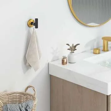 The towel hook is made from premium stainless steel with a matte black coating and a gold finish.