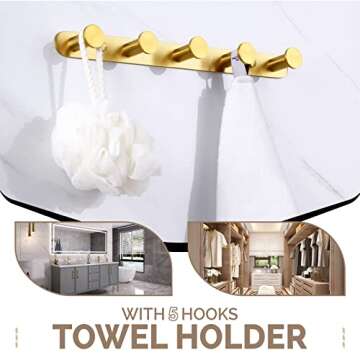 Angle Simple Towel Hook Rack Brushed Gold, SUS304 Stainless Steel Bathroom Hook Rail 5 Hooks, Utility Kitchen Towel Holder, Wall Mount