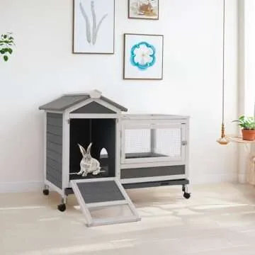 AniwuPaws Rabbit Hutch Indoor/Outdoor with Wheels/No Leak Urine Guards/Netting Floor, Rabbit Cage Chew Proof with Tray, Guinea Pig Cage, Bunny House for Small Animal 38.5" L*24.5" W*31" H, White/Grey