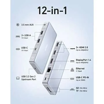 Show more Introducing the Anker 575 USB-C Hub, your ultimate solution for expanding connectivity and enhancing productivity. With a robust 12-port expansion, this versatile hub brings a new level of functionality to your workspace. It features a USB 3.2 Gen 2 Upstream Port (USB-C 10 Gbps), along with 2× USB-A ports (10 Gbps), ensuring rapid file transfers. Beyond just ports, the hub offers incredible video output capabilities with 2× HDMI 2.0 (up to 4K@60Hz) and a DisplayPort 1.4, allowing you to connect up to three monitors simultaneously. Transition your single display into a dual or triple-monitor setup for enhanced productivity like never before!