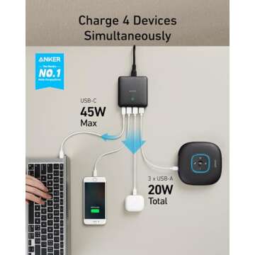 Show more Unleash the full potential of your devices with the Anker 65W 4 Port PIQ 3.0 & GaN Fast Charger Adapter. This compact powerhouse is designed specifically for tech lovers and multitaskers alike, effortlessly charging up to four devices simultaneously at lightning speed. Featuring a robust 45W USB-C port, this charger is ideal for powering high-demand gadgets like the Dell XPS 13, MacBook Air 2018, and other USB-C laptops. Say goodbye to waiting around for your devices to charge – with Anker, everything is always primed and ready!