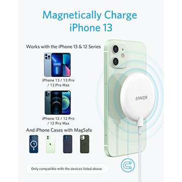 Show moreExperience the ultimate convenience in charging with the Anker 7.5W Magnetic Wireless Charger. Designed specifically for the iPhone 13 series and optimized for iPhone 14, this charger allows you to effortlessly snap your device into place with its magnetic feature. Gone are the days of fumbling around with tangled wires; simply attach the PowerWave to the back of your iPhone, and enjoy a seamless charging experience. Not only does it charge your device efficiently, but it also allows you to use all your phone’s features without obstruction. The included 5 ft USB-C cable offers flexibility, giving you the freedom to charge anywhere you desire.
