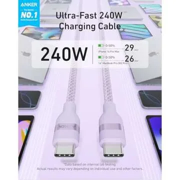 Show more Introducing the Anker Nano USB C Cable, your new charging powerhouse designed for maximum efficiency and durability. This 240W USB-IF certified cable is engineered to deliver lightning-fast charging speeds, capable of powering up your 16-inch MacBook Pro (M3 Pro) to 50% in just 26 minutes and your iPhone 16 Pro Max to 50% in 29 minutes. Its impressive specs ensure that whether you’re at home, in the office, or on the go, you’ll always be powered up and ready to rise to the occasion. Not only does it excel in performance, but it also features a soft-touch finish and a practical design for easy storage, allowing for hassle-free charging sessions without the unbearable tangles. Say goodbye to messy cables and hello to a streamlined charging experience!