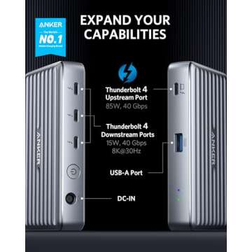 Show moreIntroducing the Anker PowerExpand 5-in-1 Thunderbolt 4 Mini Dock, the ultimate solution for connectivity and charging convenience designed for both Windows and Mac users. This sleek and compact dock is engineered with a massive 85W Thunderbolt 4 upstream port that connects seamlessly to your laptop for efficient charging, while its three downstream Thunderbolt 4 ports provide versatility for all your devices. Connect your MacBook for maximum compatibility, or harness its capabilities on any Windows 10 laptop equipped with a Thunderbolt 4 port. With the ability to charge your phone at a rapid 15W through the dock's dedicated USB-A port, this docking station is your one-stop shop for power and data.