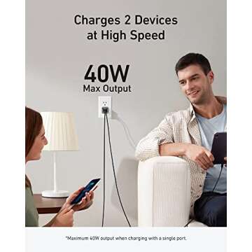 Show more Introducing the Anker 521 Charger (Nano Pro) – a revolutionary charging solution designed to meet the demands of modern technology. With a robust 40W Max Charging capability, this compact charger allows you to power up your MacBook Air at full speed when you connect to either port, ensuring efficiency and convenience. Not only does it charge your MacBook, but it also features Simultaneous Charging, enabling you to power up your iPhone 13 and your iPad simultaneously without compromising on speed.