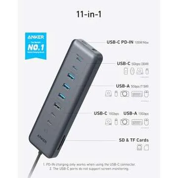 Show more The Anker USB-C 11-in-1 Data Hub is a powerhouse designed for the digital age, blending functionality with performance to meet all your device connectivity needs. With an astonishing 11 ports, this hub provides an extensive array of connectivity options including 4 USB-A ports, 4 USB-C ports, a 100W USB-C PD-IN, and dedicated SD and microSD card readers. This comprehensive configuration allows you to connect everything from your laptop or tablet to printers and storage devices seamlessly, making it ideal for both professionals and tech enthusiasts alike.