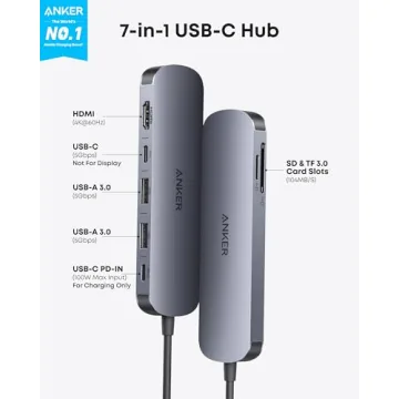 Show moreUpgrade your workspace with the Anker USB C Hub, a versatile 7-in-1 multi-port USB adapter designed specifically for laptops and Type C devices. This compact hub is packed with high-performance features, including an HDMI port, two USB-A 3.0 ports, and a USB-C data port, all capable of delivering lightning-fast data transfer speeds of up to 5Gbps. It also features a USB-C PD input port for charging your devices with a robust maximum power delivery of 85W, ensuring that you stay powered up while you work. The dual SD and TF card slots allow for seamless access and data transfer from your memory cards.