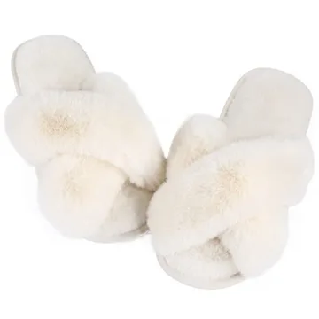 Ankis Women White Fuzzy Fluffy Slippers Soft Cozy Plush Memory Foam Slipper Open Toe Bedroom Comfy Cross Band for Womens