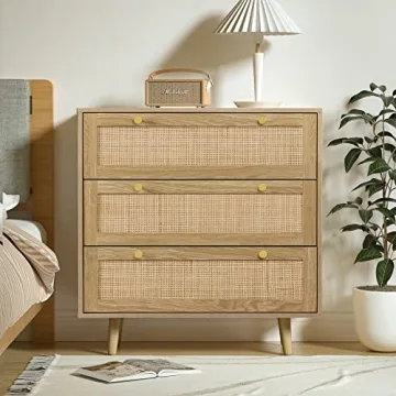 Anmytek 3 Drawer Dresser - Modern Wood Chest with Rattan Design