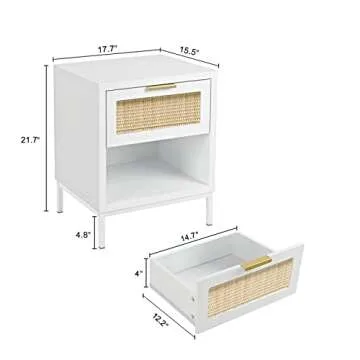 Anmytek White Nightstand with Rattan Decor Drawer, Mid Century Modern End Table with Open Storage, Farmhouse Night Stand, Small Side Table for Bedroom