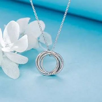 Show more Discover the elegance and meaning behind our exquisite handcrafted necklace, designed especially for that significant milestone - the 50th birthday. This beautiful piece features interlocking solid rings crafted from premium 925 sterling silver with stunning twisted ring accents. Each ring is thoughtfully intertwined and suspended from a delicate yet durable chain, allowing this necklace to bring forth a symbol of infinite love, strength, protection, and unity.